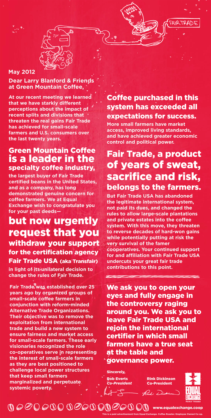 Friend of Spunk Equal Exchange Challenges GMCR to Leave Fair Trade USA